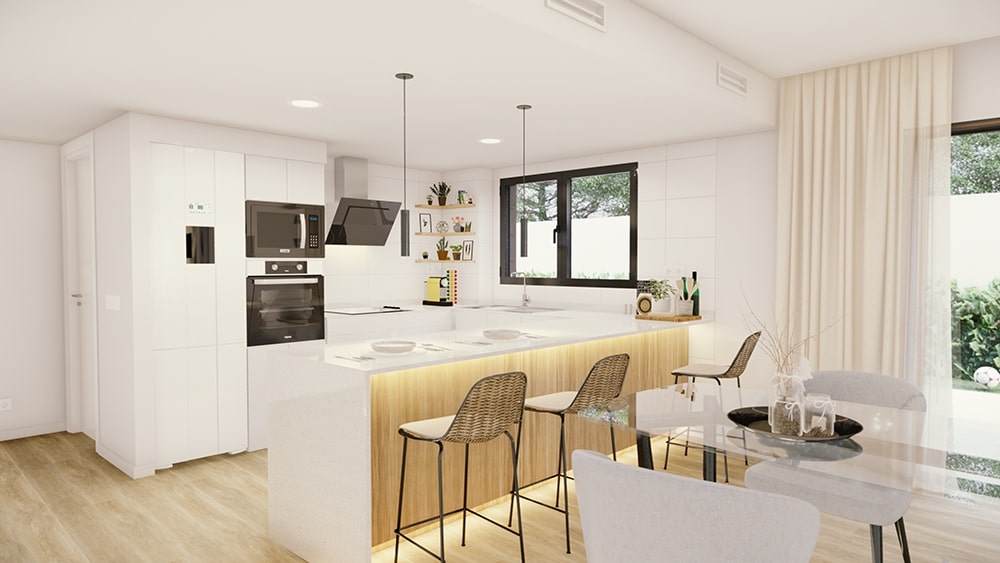 Nuestro concepto de calidad de vida implica un diseño excelente de la cocina, la cual ha sido cuidadosamente proyectada para satisfacer todas las exigencias de funcionalidad y comodidad. La cocina se compone de muebles bajos perfectamente distribuidos, columna de horno y microondas, mueble escobero, barra de madera, encimera de primera calidad, placa vitrocerámica y campana decorativa en color negro. Todo lo que necesitas y con los mejores acabados.