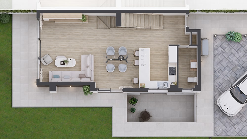 Con un total de 70.15 m2 construidos, la planta baja está compuesta por un amplio salón comedor, cocina open y un aseo.
