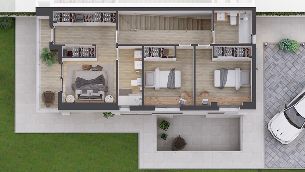 En la planta primera encontrarás tu zona de descanso, compuesta por la habitación principal en suite con terraza, dos dormitorios individuales y un baño haciendo un total de 69.16 m2 construidos.